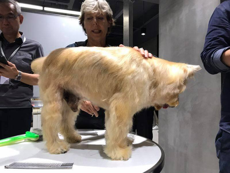 意大利讲师Massimiliano Carluccio(2015年世界美容锦标赛团队赛金牌得主)现场演示迷你雪纳瑞欧式美容,Monique老师同步解说。
